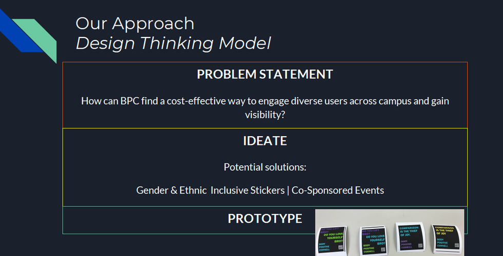 Working on the Cornell Body Positive Project was a great challenge for a multitude of reasons. We were challenged to work cohesively as a team to deliver useful recommendations to suit the needs of Body Positive Cornell which required a lot of harmony as a team, research, creativity, and emotional intelligence. I appreciated that the MannUFactory staff, Camille, helped us identify a process to approach our work with BPC: the Design Thinking method.